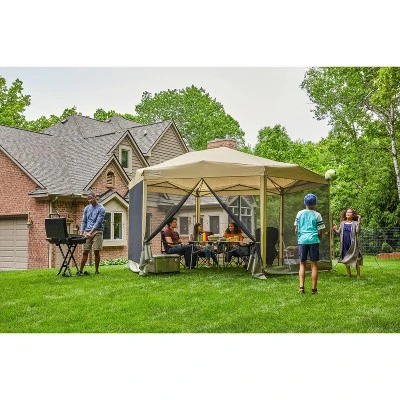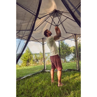 Bring on the bug-free outdoor adventures with the Coleman® Back Home™ screen canopy tents. Lounging with the family in the backyard or hanging with friends in the park? The Coleman Back Home 15 x 13 Screen Tent sets up easy using a one-push center hub with OnePeak™ technology. We made sure the screen tent fits over a picnic table so you can eat inside the enclosed mesh walls without the pests. Plus, the 2 entryways let you move all your gear in and out easily. The robust steel frame withstands winds up to 35 mph when the canopy is fully staked, and the Comfort Grip™ pinch-free buttons make the canopy easy to set up and take down. UPF 50+ sun protection helps block sun’s harmful UV rays and overhanging eaves provide even more shade. When it’s time to go, the wheeled carry bag makes it easy to pack up and go.
