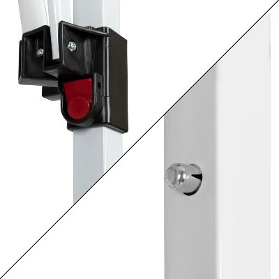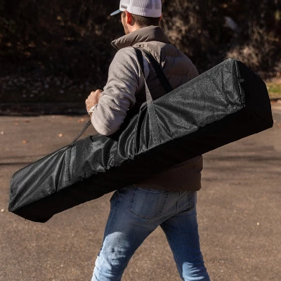 Portable shelters are an excellent way to provide shade during outdoor events and this black all-weather 8′ x 8′ pop up canopy tent will help keep you out of the elements so you can enjoy your time with family and friends. The weather resistant polyester top has reinforced corners to prevent ripping or tearing and is UV coated to resist fading from the sun’s rays. Simply unfold the fabric top, attach to the upper frame with the hook and loop fasteners, extend the bottom legs and pull open for instant protection. Strength and durability abound in this instant canopy. The white powder coated steel frame is rust and corrosion resistant and locks in place with a “pinch free” locking mechanism. The height adjustable frame takes you from the backyard to the beach and everywhere in between. This canopy pop up tent folds up when not in use and has its own bag for easy storage. This quick shade canopy includes the frame, canopy top and stabilizing ground stakes. Assembly takes less than 10 minutes and does not require tools. Take this portable shade canopy on camping trips, tailgating, the kids soccer games or for get togethers on your patio or in the yard. This party canopy tent will look great season after season. Additional Features: Height Adjustable Powder Coated Frame is weather and rust resistant, Assembles in 10 Minutes or Less; Includes Ground Stakes to anchor the structure; String Size (8): 118″, Seating Capacity with 6′ Folding Table: 8; Standing Capacity: up to 15, All Occasion Pop Up Party Canopy Tent ideal for family reunions, neighborhood block parties, tailgating, camping or as shade on your deck or patio
