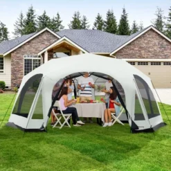 - Enough Capacity: It comfortably holds 3-4 people with ample fishing room. Overall Dimensions: 141.75″ L x 141.75″ W x 76.75″ H. Folded Dimensions: 67.75″ L x 13.75″ W x 8.75″ H. Assembly Required. Not suitable for rainy days.